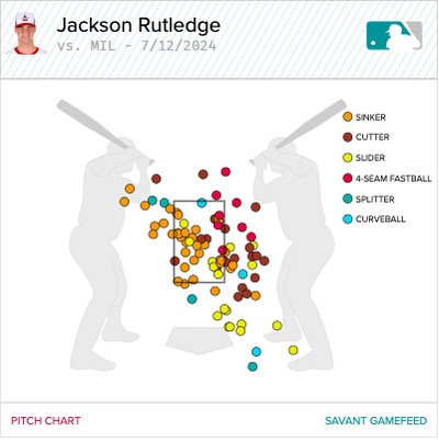 Rutledge took the mound in Milwaukee and retired the Brewers in order in a 15-pitch first, and stranded a one-out single in a 13-pitch second, then a 13-pitch, 1-2-3 third left him at just 41 pitches total, with 9 of 10 retired in three scoreless.