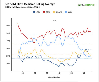 Good quality of contact? Yes, and this is important. Generally, ground balls are much less likely than fly balls and line drives to turn into hits, especially if they’re not hard hit. Over the last ten games, Mullins has substituted ground balls for line drives, while increasing his hard-hit percentage. Observe the light blue line below.