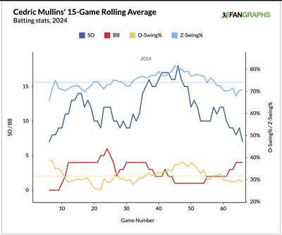 One that it isn’t: the quality of pitchers faced. Since he’s gotten hot, Mullins has hit against Taj Bradley, Zack Littell, Ryan Pepiot, Spencer Swellenbach, Reynaldo López, Ranger Suárez, Taijuan Walker, Zack Wheeler, Nestor Cortes and Gerrit Cole. Tampa Bay, Atlanta, Philadelphia and New York—these aren’t punching bags, even with the Rays struggling.