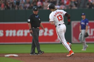 Kjerstad singled in the first and hit a two-run home run, his first of the season, against Texas starter Jon Gray (3-4). Cedric Mullins hit his second home run in as many days, his ninth, a two-run home run in the fourth. Gray was charged with eight runs in five innings.