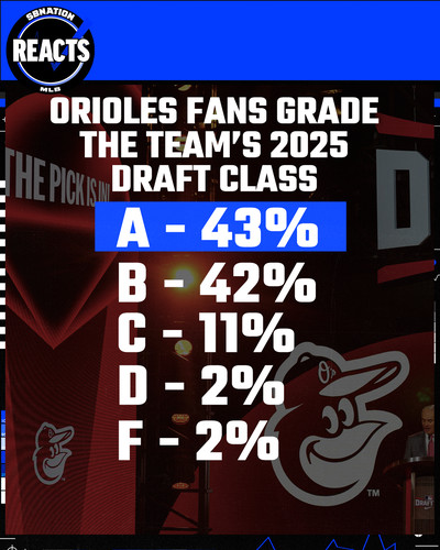 In taking the best player available without going heavy on some of their favorite archetypes, the O’s, at least as far as anyone can tell initially, seem to have done quite well for themselves and fans are feeling that too. 85% of voters coming in at either A or B for the class is a strong consensus. I’m in the A category, myself. A few years down the road, if at least two of those top 37 picks are making a positive impact and at least one of the late-round pitchers is clicking, that’s what would help it still look like an A.