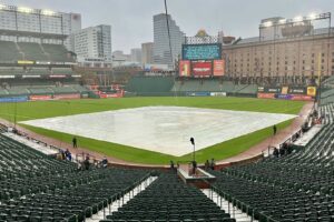 BALTIMORE–Wednesday’s game between the Orioles and Kansas City Royals, which was scheduled to begin at 1:05 p.m., will begin at 6:05. That’s a five-hour rain delay.