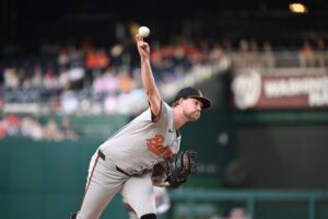 Oriole starter Kyle Bradish allowed his first two batters to reach. Jacob Young led off with a single and CJ Abrams was hit by a pitch, but he retired the next three hitters.