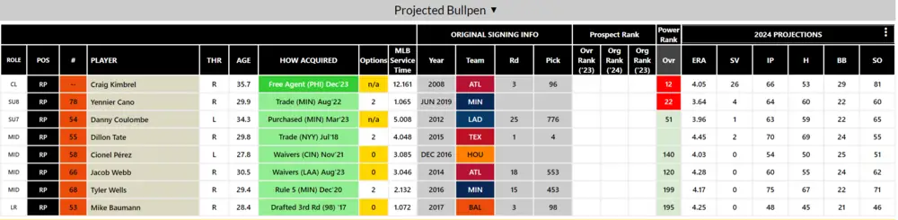 Setup/MR: Dillon Tate – Who actually knows what you can expect from Tate after missing all of 2023 with right elbow/forearm injuries? Tate reportedly “Looks unbelievable” according to manager Brandon Hyde after seeing him in some workouts in January, but he’ll be 30-years old this year and has never been a guy who misses many bats. He has two options available as well so he could be sent back to AAA for depth in order to keep guys out of options.