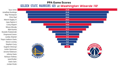 Below are a few performance metrics, including the Player Production Average (PPA) Game Score. PPA is my overall production metric, which credits players for things they do that help a team win (scoring, rebounding, playmaking, defending) and dings them for things that hurt (missed shots, turnovers, bad defense, fouls).