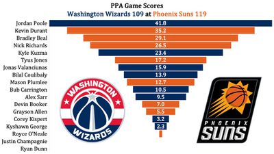 The Wizards stayed as close as they did largely due to ye olde three point variance. Washington entered the game as the NBA’s second worst three-point shooting team (33.0%) and hit 18-41, 43.9%. The Suns came in as the league’s fifth best three-point shooting team (37.6%) and shot just 13-40, 32.5%. That gave them a +15 advantage from three.