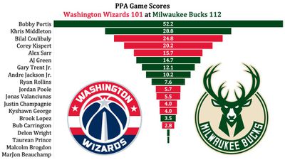 The Wizards got wrecked by Bobby Portis, who had 34 points, 10 rebounds, and a career-high 8 assists in just 32 minutes. Portis added three steals and a block and knocked down 6-9 from deep.