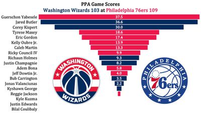 The game was an entertaining romp despite the absence of “star power,” in part because of all the next-man-upping. French big man Guerschon Yabesele started in place of Embiid and lit the Wizards up for 21 points (on 11 shots), 8 rebounds, 3 assists, and 2 blocks — one of which was on a driving layup attempt by Bilal Coulibaly, which would have tied the game with 14 seconds left in regulation.