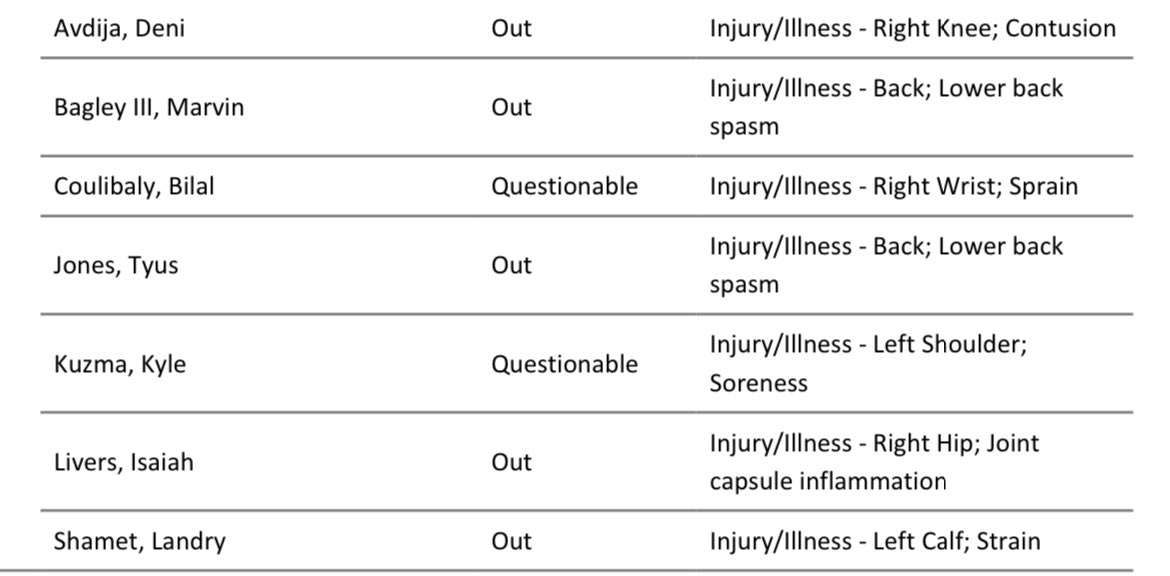 The Wizards have listed Bilal Coulibaly (right wrist sprain) and Kyle Kuzma (left shoulder soreness) as questionable to play against the Celtics tonight. Deni Avdija (right knee contusion) is doubtful to play. Marvin Bagley III, Tyus Jones, Isaiah Livers & Landry Shamet are out. – 1:54 PM