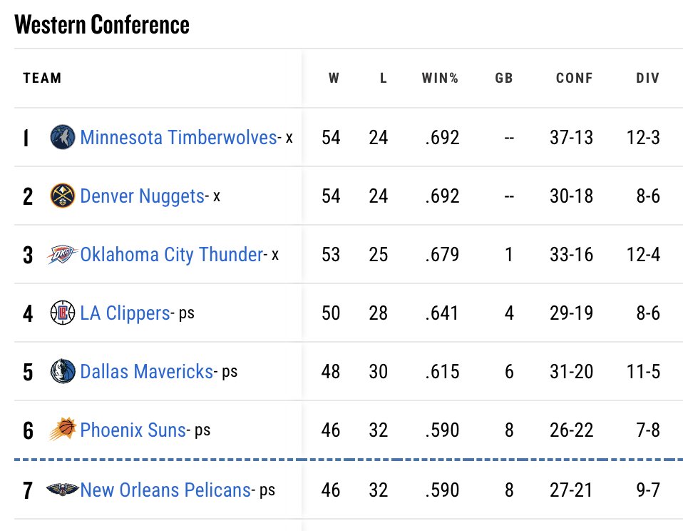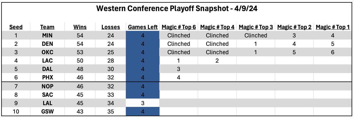 For the Nuggets, a win tonight guarantees a Top 3 seed, but they have to win out if they want top 2.