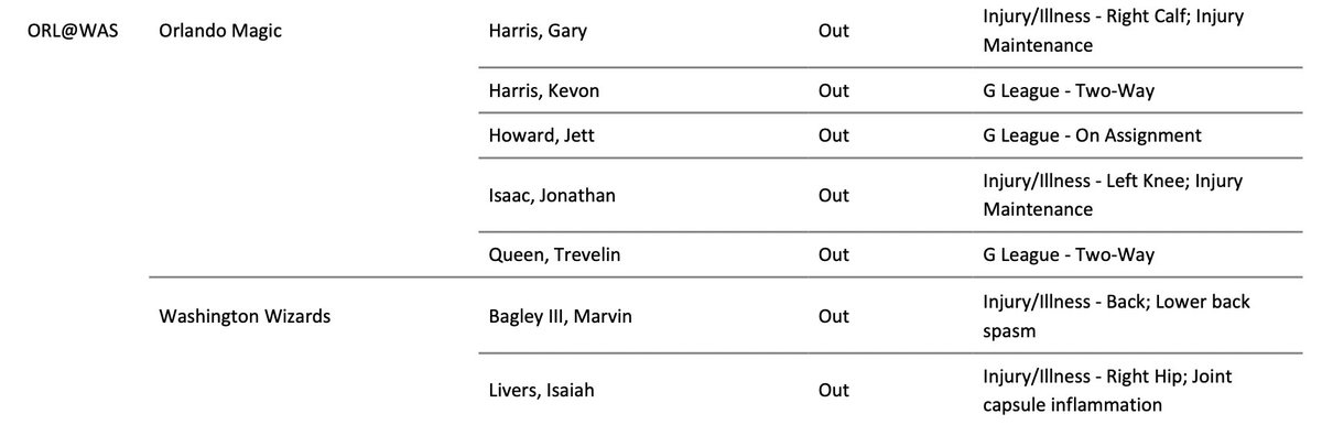The Magic will be without the following players tonight against the Wizards: