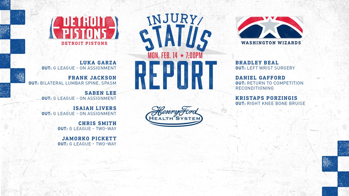 Tonight’s @HenryFordNews injury/status report against the Washington Wizards