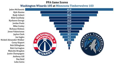 It was a close contest throughout with the Wizards building leads followed by a Timberwolves rally. Washington led most of the way — leaping ahead by as much as 11 late in the third quarter.