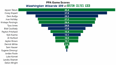 Below are a few performance metrics, including the Player Production Average (PPA) Game Score. PPA is my overall production metric, which credits players for things they do that help a team win (scoring, rebounding, playmaking, defending) and dings them for things that hurt (missed shots, turnovers, bad defense, fouls).