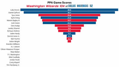 Below are a few performance metrics, including the Player Production Average (PPA) Game Score. PPA is my overall production metric, which credits players for things they do that help a team win (scoring, rebounding, playmaking, defending) and dings them for things that hurt (missed shots, turnovers, bad defense, fouls).