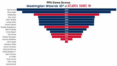 My characterization of this as a bad shooting night by Atlanta is intentional. The Wizards permitted their usual high number of open looks. The Hawks just missed. They also had trouble keeping Atlanta from getting offensive rebounds. The Hawks simply couldn’t get the usual tip-ins and putbacks to go through the hoop.