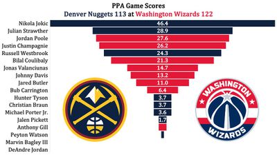 The key to Washington’s victory was shooting — 57.0% effective field goal percentage for the Wizards to 51.6% for Denver, even though the Nuggets largely had their way inside. Denver’s inability to knock down open looks from the three-point line was a serious drag on their offensive performance.