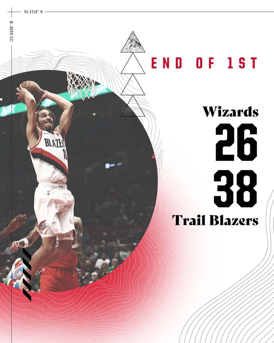 Blazers 38, Wizards 26: end of first quarter. 11 points, 4 rebounds, 3 assists for @Josh Hart. 11 points, 1 rebound/steal for @Trendon Watford. 10 points, 6 rebounds, 2 assists for @Drew Eubanks. – 10:35 PM