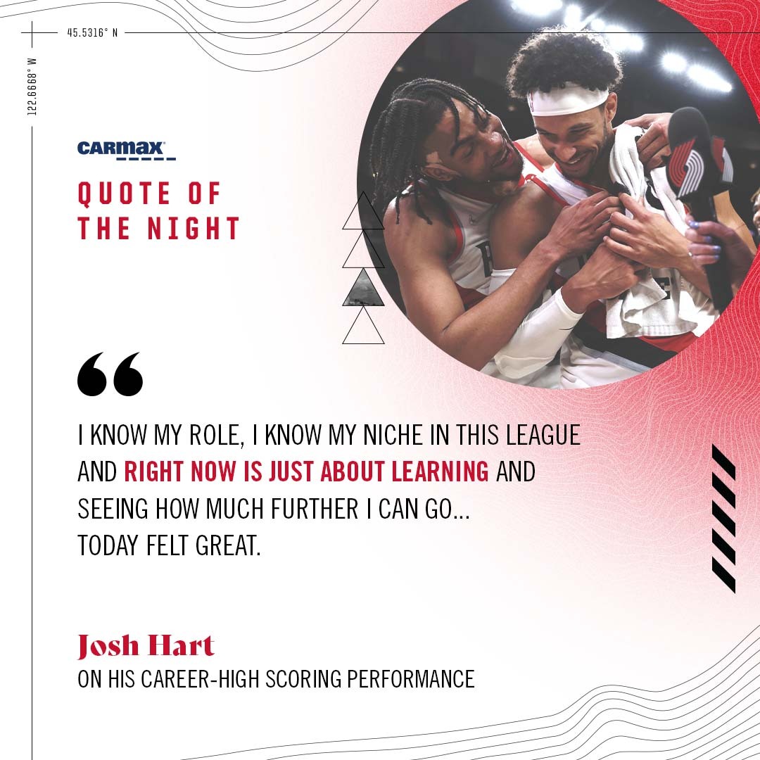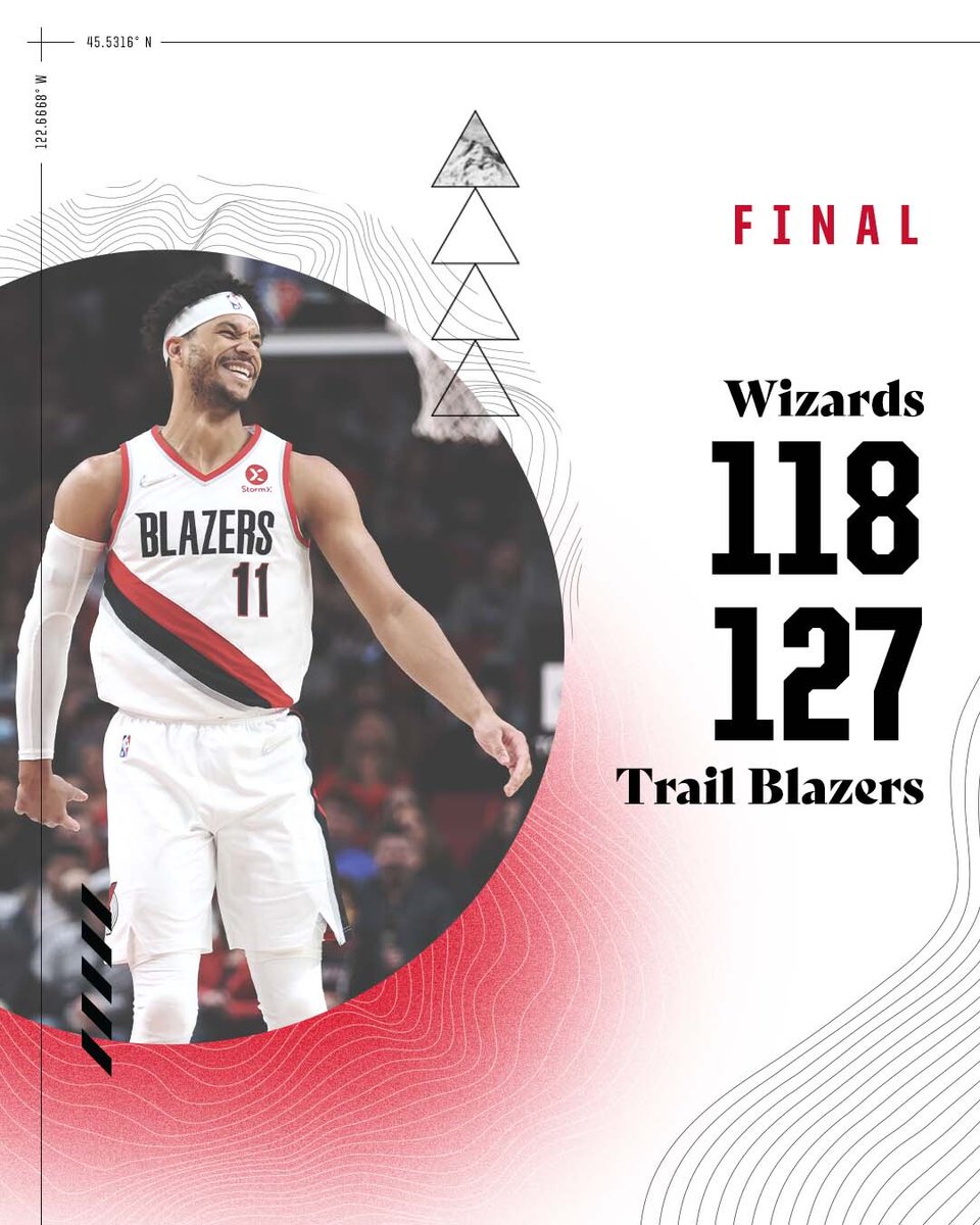 Blazers 127, Wizards 118: FINAL. Career high 44 points, 8 rebounds, 6 assists, 4 steals for @Josh Hart. Career high 27 points, 6 rebounds, 3 assists, 2 steals for @Trendon Watford. Career high 20 points, 12 rebounds, 3 assists for @Drew Eubanks. 10 apiece for @CJ Elleby and Williams. – 12:22 AM