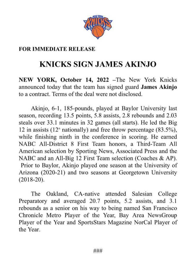 Knicks announce that they’ve signed guard James Akinjo. Akinjo would be the 20th player on the roster, which is the maximum amount teams can carry on the preseason. – 3:51 PM