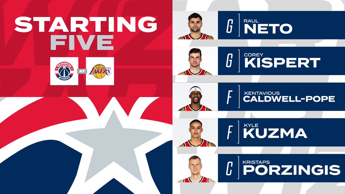 Wizards starters tonight against the Lakers: Raul Neto, Corey Kispert, Kentavious Caldwell-Pope, Kyle Kuzma and Kristaps Porzingis. – 9:12 PM