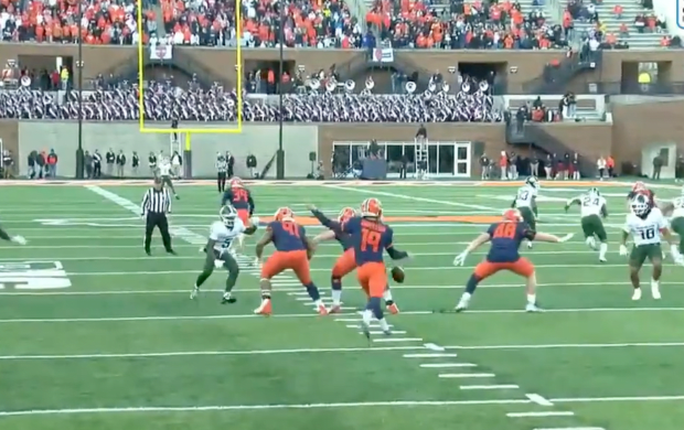 The ball hit the elbow of one of Robertson’s teammates in front of him. It resulted in a deflection in favor of the Spartans. The outcome? A two-yard punt for the Illini.