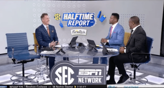 Previewing some of the upcoming matchups at the halftime break between Vanderbilt and Florida, the SEC studio crew had a lighthearted exchange about Ben Watson’s choice of a light-colored suit this Saturday.