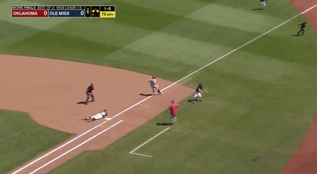 A controversial umpire ruling in the top of the sixth inning might help the Rebels get there.