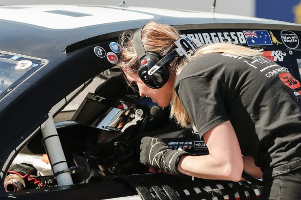 Sarah Burgess is the pit crew chief for BMI Racing, which oversees Bridget Burgess’ racing career on the ARCA circuit. Unfortunately, due to financial reasons, Sarah is often the one who does all of Bridget’s pit crew duties herself.
