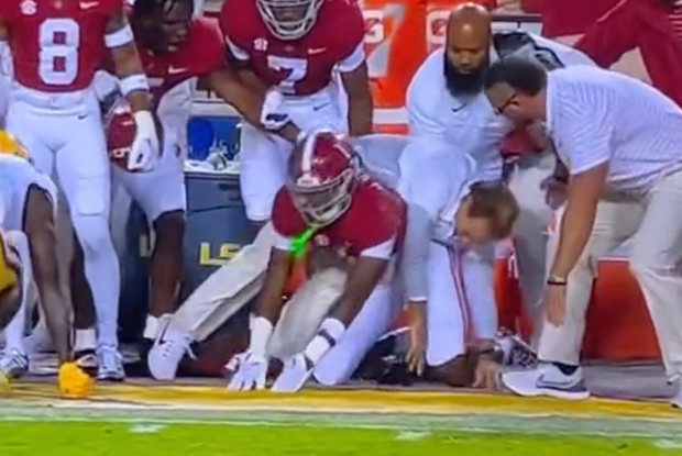 “Nick Saban took a hard fall after Kool-Aid McKinstry ran into him on the sideline. He got right up like a champ though,” said Touchdown Alabama.