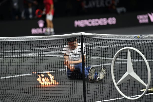 Hours before Roger Federer’s final professional match, a protester decided to light his arm on fire at the Laver Cup. No, we’re not kidding.