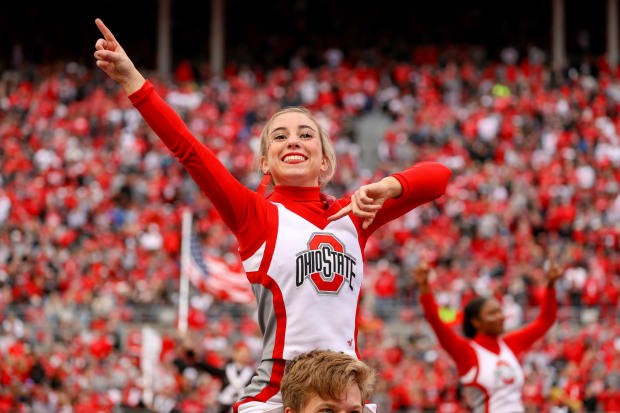 GameDay shared a video of Ohio State cheerleaders executing a flipping stunt. It was the first stunt the male cheerleader had landed in his young collegiate cheerleading career.