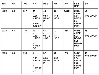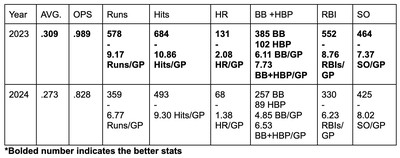 Maryland’s offense was better in 2023 than 2024 in every category. Below is the stat breakdown between the overall team hitting from last year to this year.