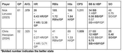 In all fairness, Hacopian was never expected to match Lorusso’s production as a freshman; however, Lorusso was still better in every statistical category except hit-by-pitches and strikeouts.