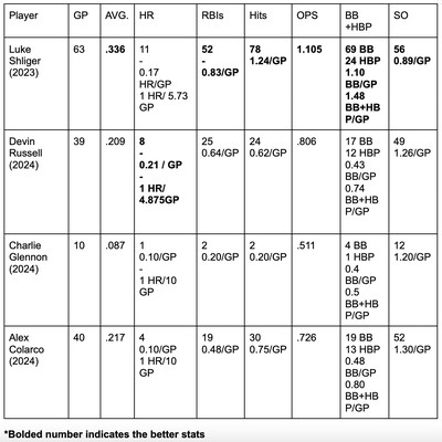 Below is a breakdown of Shliger’s 2023 season and Russell, Calarco and Glennon this year.