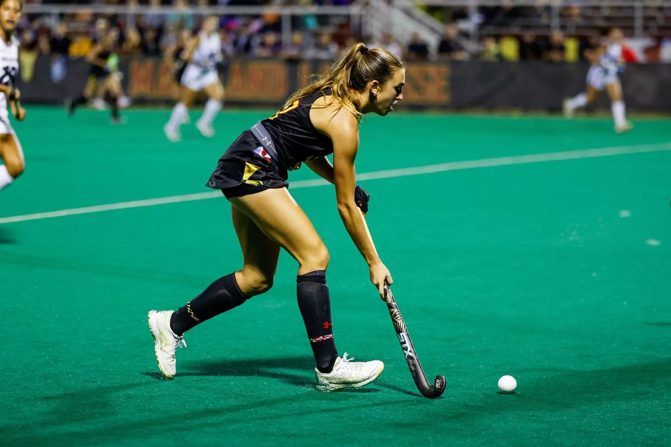 Klijnhout had the ball deep, quarterbacking the Maryland offense as it attempted to find ground inside the circle. Klijnhout opted for the simple pass, finding Rose sitting on the edge of the circle. Rose took one touch and two steps, peeling off to her left, eyed up the goal, and took a ferocious swing. The shot arced towards the far side of the net, giving Canelli no chance to stop the ball crashing off the side panel and pushing the Terp lead to three.