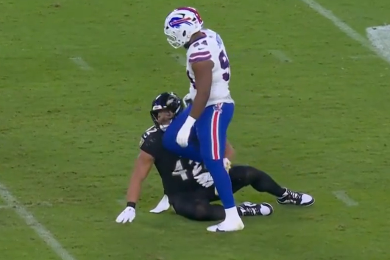 Buffalo Bills defenders appear rather frustrated in the first quarter as they’ve been ran over for more than 100 yards in the first 15. And with lead blocking fullback Patrick Ricard bullying their defenders, defensive lineman Duwuane Smoot decided he couldn’t between him between the whistles.