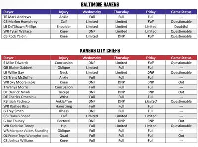 The Kansas City Chiefs are banged up heading into the AFC Championship Game against the Baltimore Ravens. In addition to two players that are on injured reserve, the Chiefs have 15 players on their injury report this week.