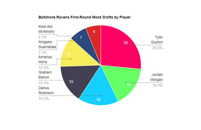 Going by player, the Ravens have been mocked most to select offensive tackle OT Tyler Guyton (26), OT Jordan Morgan (16) and EDGE Darius Robinson (16).
