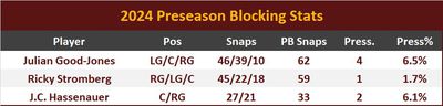 Is the starting situation and depth at LG really in a better place than either OT position? Or will the weakest link on last season’s offensive line continue to be the biggest problem in 2024? To get a better handle on the prospects of seeing an improvement at LG in 2024, I had a looking at the blocking stats for all of the players competing for the starting LG position and backup iOL positions this preseason.