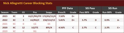 You can see where Over the Cap was coming from. Allegretti got enough playing time to generate reliable blocking stats in three NFL seasons. In 2023, he played 160 pass blocking snaps, in 6 regular season games and three playoffs, predominantly at LG. His Pressure Rate (Press%) allowed in pass protection was better than Washington starter Saahdiq Charles (8.13%), but not enough to elevate him above the low end of NFL starters. Charles was the lowest rated starting guard in pass protection.
