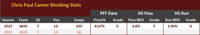 Paul started 7 games for the Commanders last season, and was a little worse in pass protection than Saahdiq Charles. He was a little better in run blocking, but not good for a starting guard. He played 66 snaps in one start as a rookie, which is not enough to grade his blocking performance.