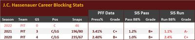 In the absence of actual NFL game experience, the best available indicators of blocking performance for these players are their stats from the first two preseason games. Since Hassenauer has not significant playing time since 2021, I included his preseason data as well. SIS does not make their preseason data available for free, so this is limited to Pressure Rate data from PFF. None of the players have got enough playing time for the data to be reliable, so I didn’t think it was worthwhile to go the extra step and provide blocking grades.