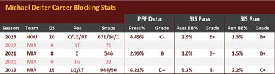 Deiter’s best season was in 2021, when he graded above average in pass and run blocking by all metrics. Overall, he grades well in run blocking, but not well consistently in pass blocking.