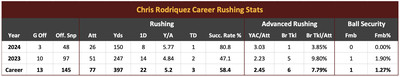 Rodriguez also breaks tackles at a fair rate. In two seasons with the Commanders he has broken 6 tackles, which equates to a broken tackle rate of 7.79%. That figure is equivalent to the 23rd highest broken tackle rate among 67 RBs with a minimum of 40 carries in 2024.