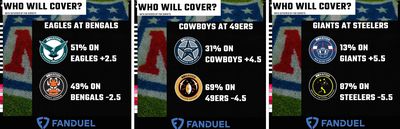 Only about half of those surveyed picked the Eagles when given 2.5 points. In the other two games, nearly 7 of 10 respondents picked the Niners to cover a 4.5-point spread against the underdog Cowboys, and close to 9 of 10 picked the Steelers to cover the spread against the Giants on Monday Night Football.