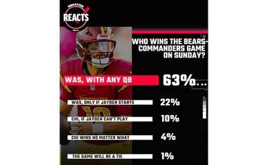 More than 6 out of 10 Hogs Haven readers who responded picked the Commanders to win no matter who starts at QB, with another 22% picking Washington if Jayden Daniels plays the game. Only 4% of respondents picked the Bears to win against Daniels, with another 10% seeing a Chicago victory in the cards if Marcus Mariota starts on Sunday.