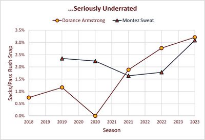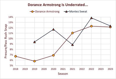 It would appear that everyone has been sleeping on Dorance Armstrong. Armstrong’s pass rush productivity in limited opportunities has been steeply rising over the past three seasons. It took him longer in his career to get there, but last season Armsrtong had the same pass rush productivity as the Commanders’ departed star edge rusher. He just got less playing time.
