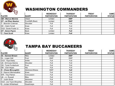 The Washington Commanders are preparing for their season opener against the Tampa Bay Buccaneers and have several players dealing with injuries from the preseason/training camp. Two players went from limited to did not participate today, and the other two limited players from yesterday returned to full participants.