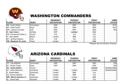 Washington Commanders vs Arizona Cardinals Friday Injury Report: Three players ruled out#RaiseHailhttps://t.co/eijOytZWar